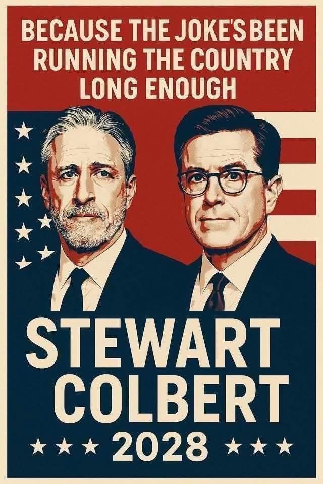 And now for the obligatory legal disclaimer: This web site is just an idea. It has no basis in reality until you make it happen. This is not a grift. We are not collecting money. We are not collecting email addresses. This is about all of us and whether we have the collective will to combat adversity and authoritarianism and win. This web site humbly presents one idea to achieve that goal. This web site has absolutely no connection to Jon Stewart, Stephen Colbert, The Daily Show, The Weekly Show, The Late Show or, quite frankly, any other show. This web site also has no connection to Ark Angel, Billy Rose's Music Hall, Busboy Productions, CBS, CBS Broadcasting, CBS Radio Playhouse No. 3, CBS Studio 50, CBS Television Studios, Chelsea Television Studios, Comedy Central, Comedy Partners, Ed Sullivan Theater, Hammerstein's Theatre, Late Night Cartoons, Inc., Licht Media Solutions, Mad Cow Productions, Manhattan Theatre, MTV Entertainment Studios, MTV Productions, NEP, Paramount, Paramount Domestic Television, Paramount Global, RJ Fried Worldwide, Showtime Networks, Skydance, Spartina Productions, Worldwide Pants, or any of their rogue employees (of which there are legion).